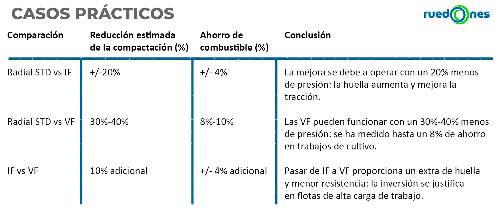 💡 Esta comparativa muestra que la tecnología VF aporta ventajas significativas cuando se busca minimizar la compactación y optimizar el consumo de combustible. No obstante, cada caso es distinto: en explotaciones más pequeñas o con cargas de trabajo moderadas, los neumáticos IF son suficientes.